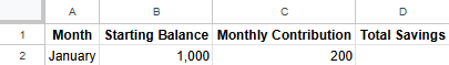 A1: "Month" | B1: "Starting Balance" | C1: "Monthly Contribution" | D1: "Total Savings"